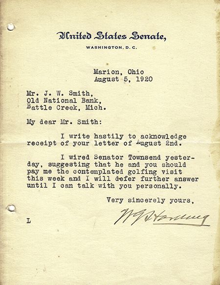 (1865-1923) Twenty-ninth President of the United States. Good content T.L.S. on Senate letterhead, 1p. 8vo., Washington, Aug. 5, 1920: "...I wired Senator Townsend yesterday, suggesting that he and you should pay me the contemplated golfing visit this week and I will defer further answer until I can talk to you personally...". File holes at left margin, light soiling, else very good. More than any president, Harding loved golf and conducted a great deal of official business on the greens.