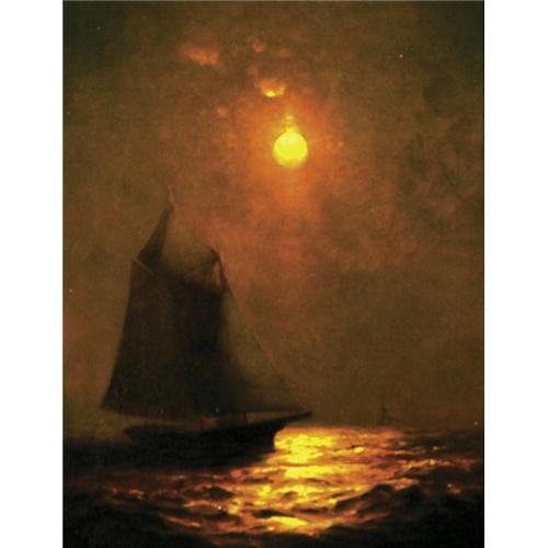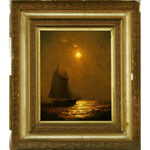 <B>WARREN SHEPPARD (American 1858-1937)</B></I><BR><I>Moonlit Sail</B></I><BR>Oil on canvas<BR>10.25in. x 8.25in.<BR>Signed lower right<BR>1 Items <BR><BR><B>Condition Report:</B> unlined original canvas, minor touches of overpaint at waterline of boat and in lower sail, small area of inpainting in sky upper left.