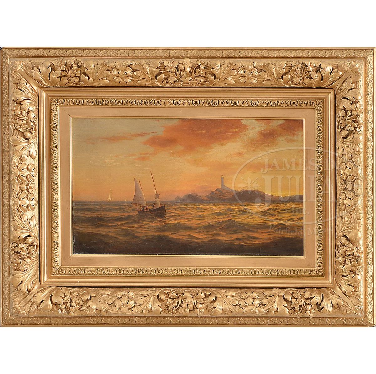 Oil on canvas Housed in a 19th century gesso decorated frame in gold paint Signed "Warren Sheppard 1866", lower right SIZE: Sight: 12" x 20". Overall: 23-1/2" x 31-1/2" CONDITION: Lined, some inpainting, very good 9-29584