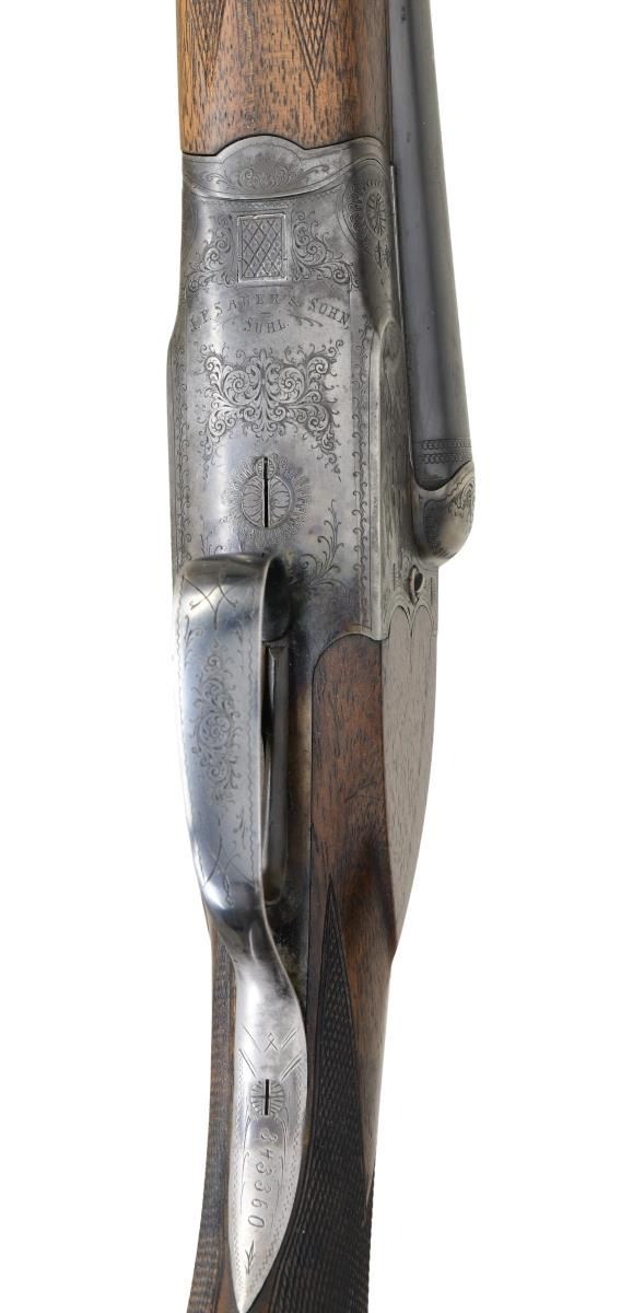 EJECTOR GAME GUN WITH CASE. Cal. 16 Ga. 2-9/16". S# 343360. The 27-5/8" shoe lump barrels are engraved with maker's name and address in milled out portion of slightly raised matted game rib. Sauer caveman logo is on rib extension. Tops of barrels are maked with Krupp Steel info. Barrel flats are stamped with June 1944 Nazi eagle nitro proofs. Case hardened boxlock scallop backed action features automatic safety, cross bolt third fastener, intercepting safely sears, raised rib cocking indicators on sides and double triggers. Action is engraved in simplified 380 grade style with well cut scroll within line and scroll borders surrounding well done game scenes on sides of action. Three ducks in marsh scene on left, with a setter flushing a grouse on right, while two others remain on ground. Bottom of action is engraved with maker's name and address. Steel trigger guard with scroll on bow has S# on tang. Pistol grip buttstock of lightly marbled and figured European walnut measures 14-1/4" over ribbed horn buttplate with Sauer "SSU" logo. Stock features shadowline right hand cheekpiece, point pattern checkering which wraps over top of grip and a sling loop on toeline that matches loop screwed to bottom of barrels. Matching long splinter ejector forend with inlet schabled horn tip has Deeley release. MEASUREMENTS: BBLS: Bore Diameter: L .666. R .665. Restriction: L .022 (mod). R .009 (IC). Wall thickness: L .030. R .026. STOCK: DAH: 2-11/16". DAC: 1-9/16". CAST: neutral. LOP: 14-1/4". WEIGHT: 6 lb. 4 oz. UNATTACHED ACCESSORIES: gun comes with a tan canvas German style case, lined in green cloth. CONDITION: very good to fine. Barrels retaining about 80% original blue with light wear and marks overall. Action retains most of its original case hardening color which is strong where protected. Stocks retain nearly 80% of their original finish with a fair scattering of marks. Grip cap is missing. Bores are bright and shiny. Action has just a hint of looseness. Mechanically good. Ejectors in time. Grip checkering has been cleaned up with evidence of some repairs at grip. (23-6995/MGM). CURIO. $1,500-3,000.