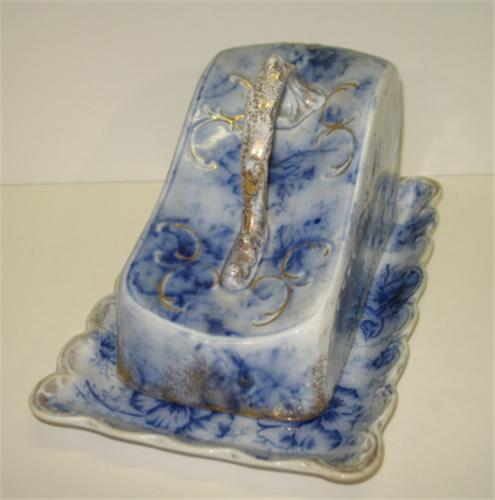 WARWICK COVERED CHEESE DISH. Blue floral decorated. Loss to gilt at handle on lid and on base. Marked on bottom “Warwick, China”. 5” H, 10.5” L, 6.25” W