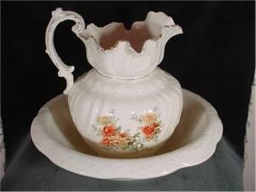 WASH STAND PITCHER 12"X10" AND BOWL5"X16" HANDPAINTED IN A DECORATIVE FLORAL MOTIF AND MARKED WITH A FOUR DIGIT NUMBER ON THE BOTTOM.