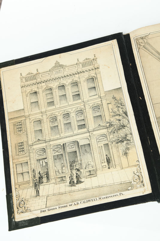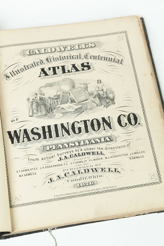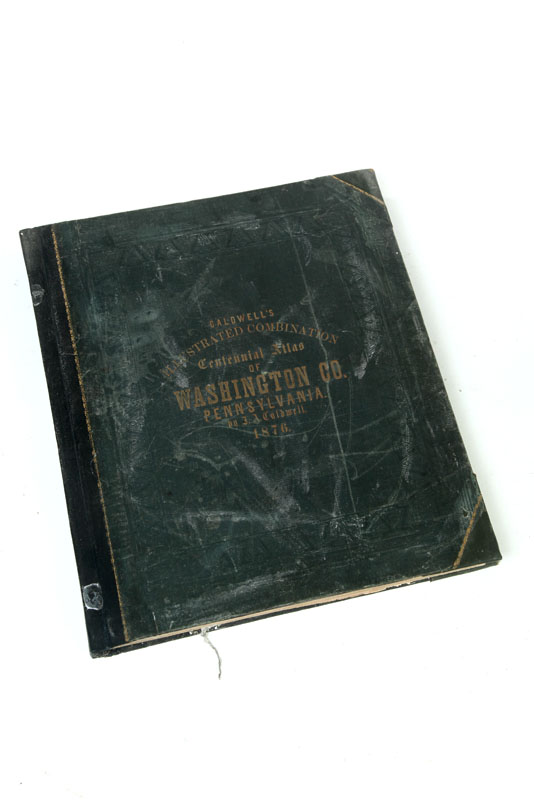 Caldwell's Illustrated Combination Centennial Atlas of Washington Co. Pennsylvania by J.A. Caldwell, published in Condit, Ohio in 1876. Two hundred twenty-five pages. Tall folio, complete, reinforced binding, edge wear to pages.