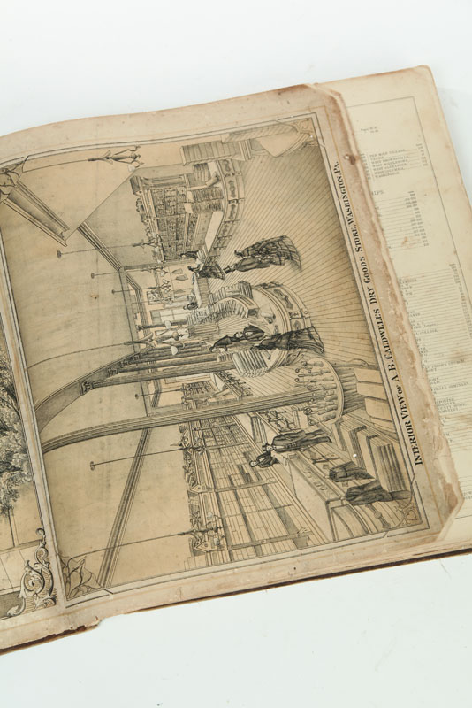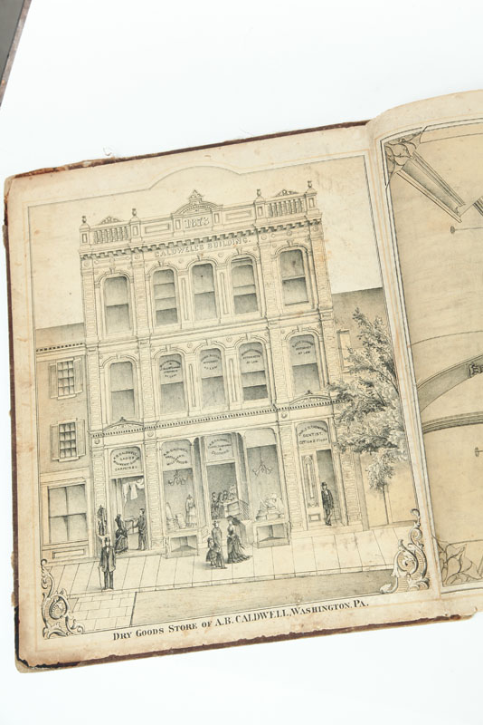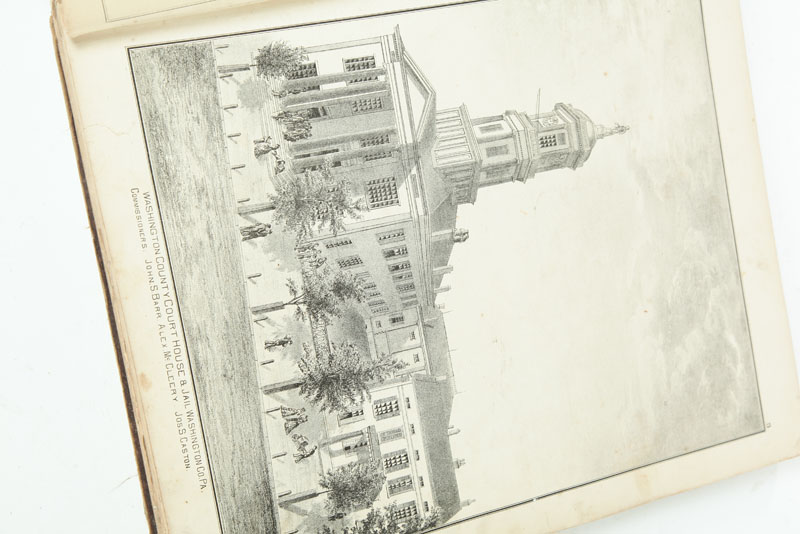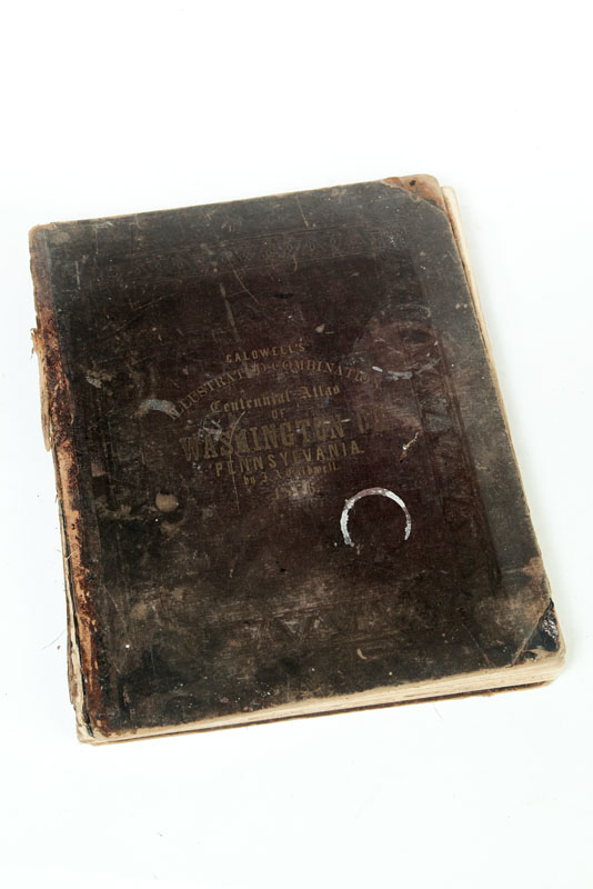 Caldwell's Illustrated Combination Centennial Atlas of Washington Co. Pennsylvania by J.A. Caldwell. Published in Condit, Ohio in 1876. Two hundred twenty-five pages. Tall folio, complete, front and back boards loose, worn edges.