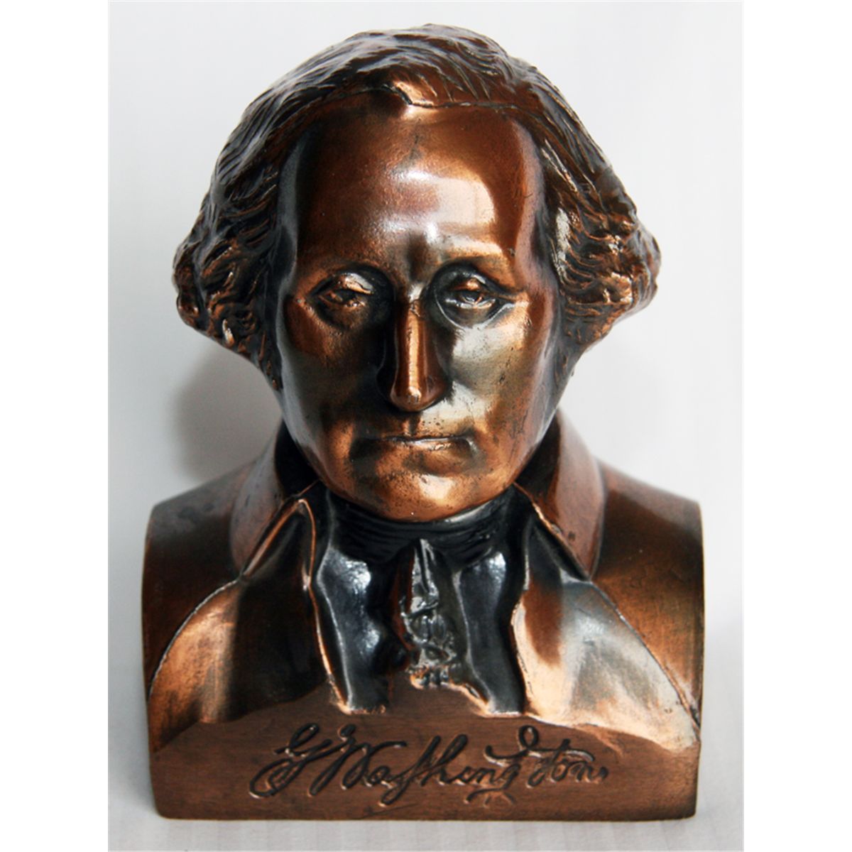 WASHINGTON MUTUAL SAVINGS BANK, MEMBER F.D.I.C. Bank in shape of a Bust of George Washington. Coin slot on bottom. No handle. Key lock, with key present. No serial number or patent information. 9cm x 13cm x 6cm. A Brass bank, with a burnished finish. Maker-Banthrico, Inc., Chicago, USA. VF.