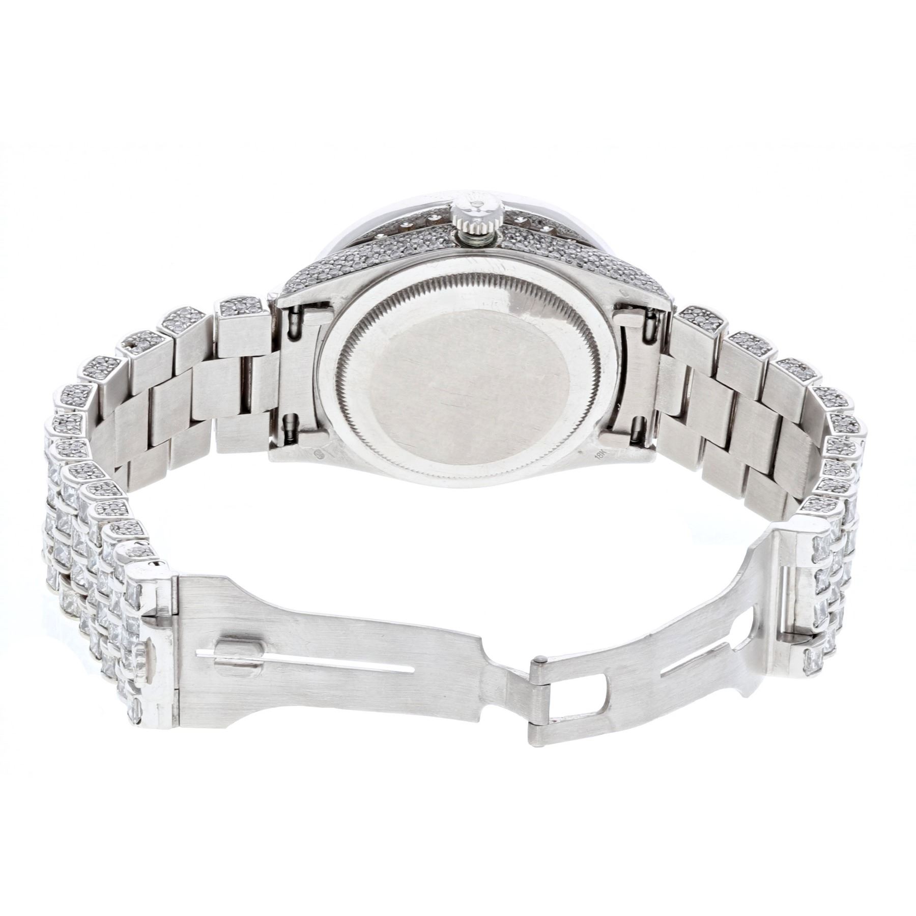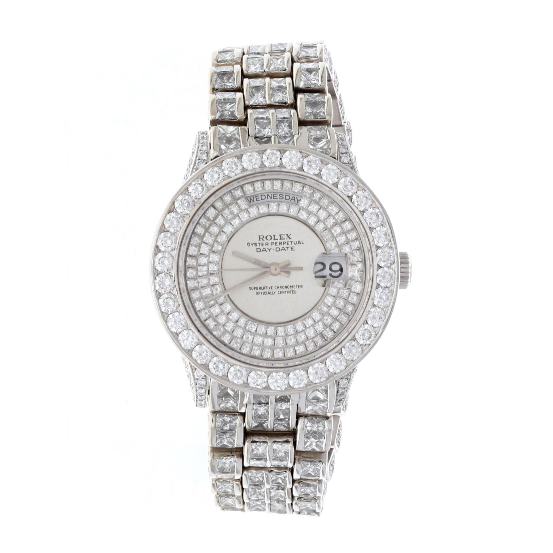 WATCH: [1] 18 karat white gold gents Rolex Oyster Perpetual Day-Date President watch set with aftermarket round and princess cut diamonds in the case, lugs, aftermarket dial, aftermarket bezel and aftermarket band, approx. 34.13 carats total weight, G-J color, VS2-SI1 clarity; model #18039, serial #U700871 (circa 1997), movement #3155, movement serial #7612903, band #55B, clasp #8385