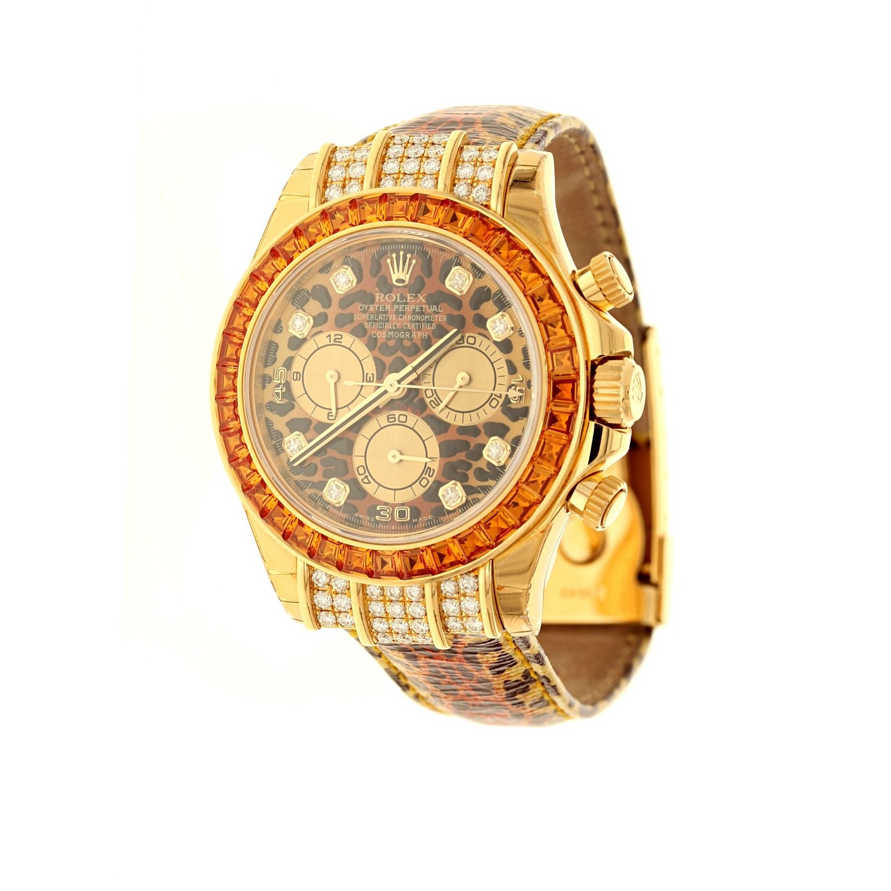 WATCH: [1] 18 karat yellow gold gents Rolex Oyster Perpetual Cosmograph Daytona with a Leopard dial and strap, a factory cognac orange sapphire set bezel and the case is set with 48 round diamonds, approx. 1.00 carat total weight, F-G color, VS clarity; model #116598, serial #V751591 (2008), movement #4130 Daytona, movement serial #243939Z7, clasp #24643