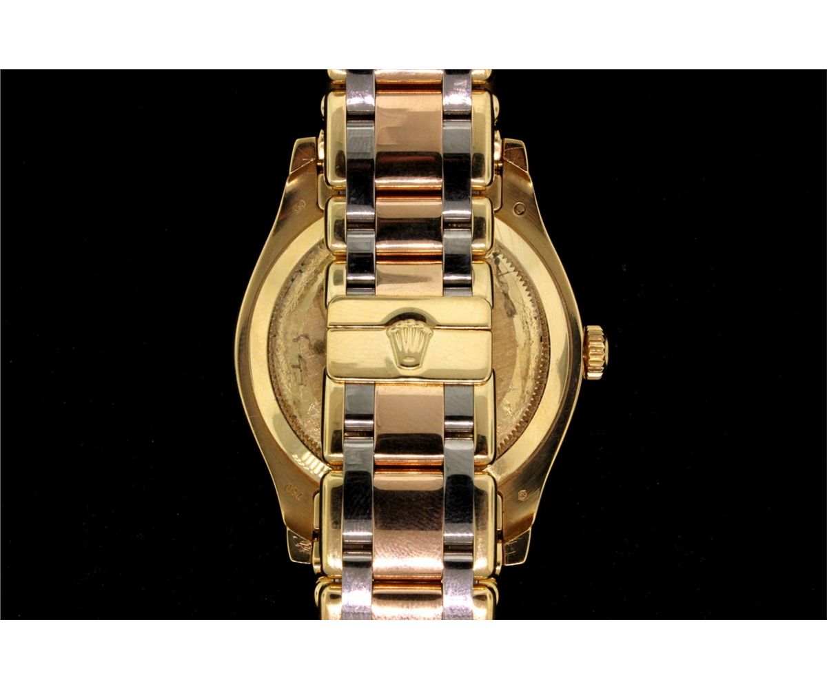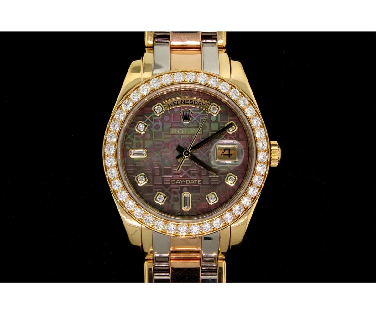 WATCH: [1] 18K tri-gold gents Rolex Masterpiece Day-Date watch with masterpiece jubilee dia. marker dial, bezel set with 40 rd dia.s, F/G, VVS and 18K tri-gold oyster bracelet, circa 2006; model #18948, serial #Z870771, movement #3155, movement serial #3 1589312, bracelet #72748 E05 750