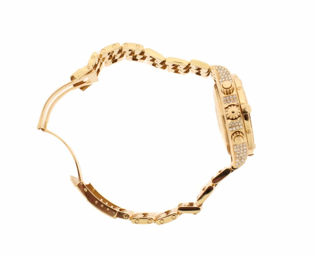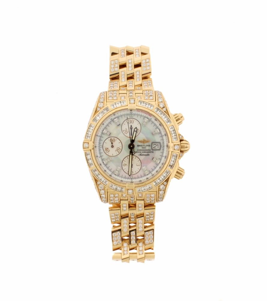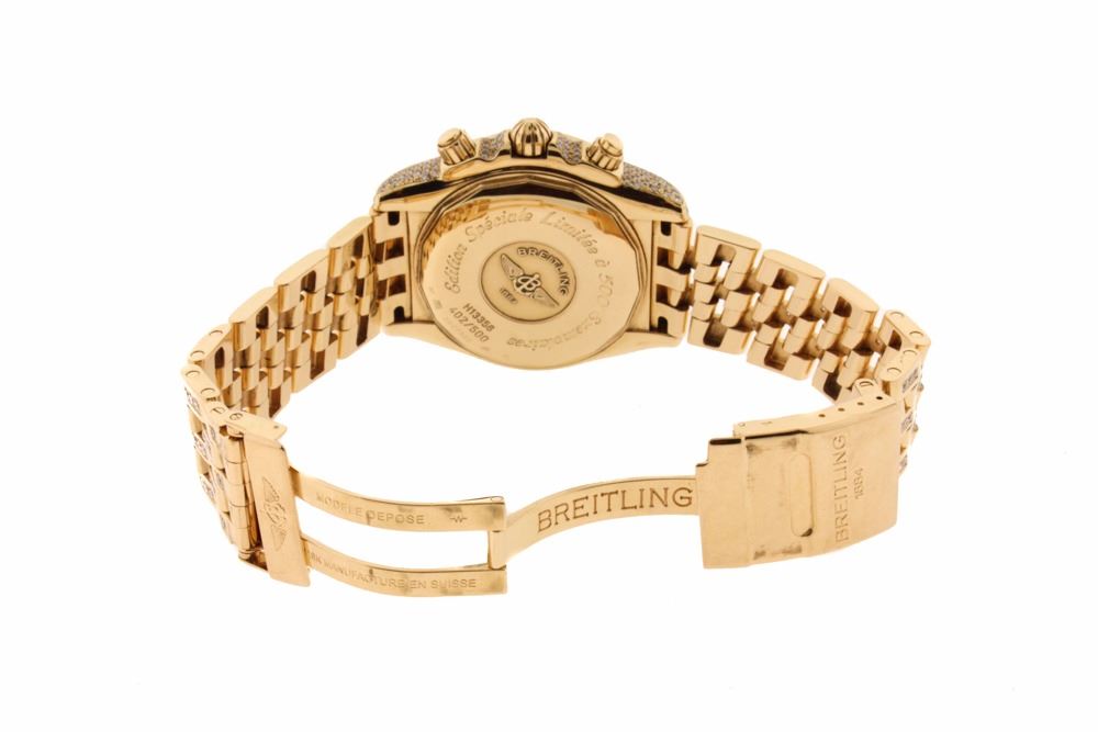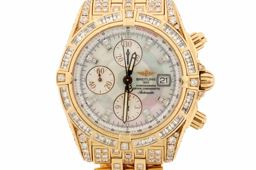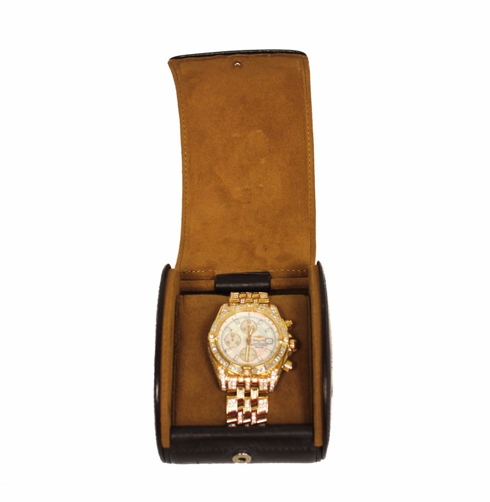 WATCH: [1] 18KRG gents Breitling Evolution Automatic Chronograph watch with a mother-of-pearl dial with diamond markers, the bezel is set with 40 French square cut and 4 round cut diamonds, the case and bracelet are set with round diamonds, approx. 12.25 cttw., good/ G-H/ VS1-SI1; model #H13356, Special Edition #402/500, serial #2527322; includes leather storage box
