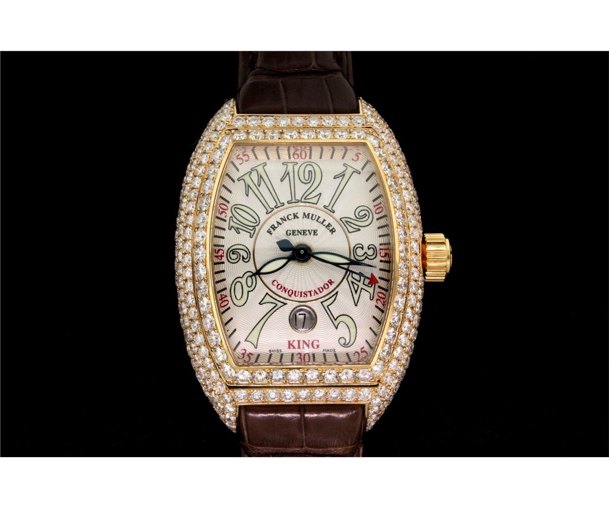 WATCH: [1] 18KYG gents Franck Muller SC King Conquistador automatic watch with white guilloche dial, date, case and bezel set with aftermarket dia.s, TWA 11.23 cts., G/H, VS2-SI1, and brown leather strap with 18KYG buckle; model #8005 SC King Conquistador, serial #39