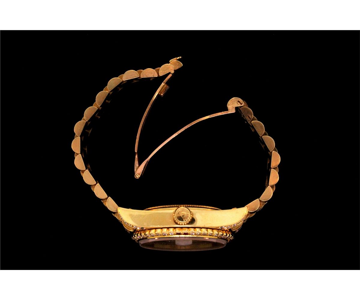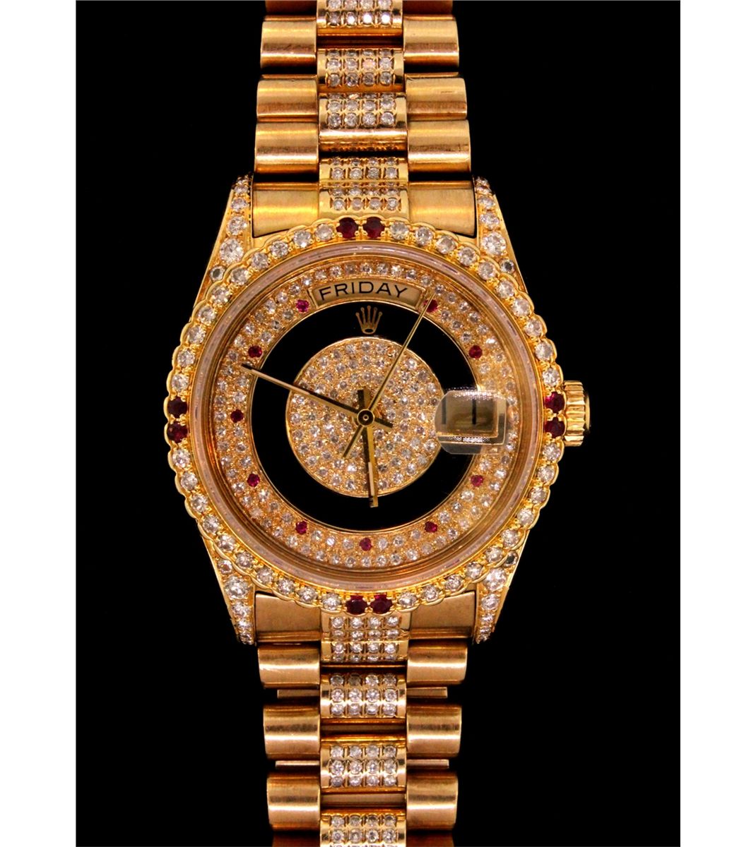 WATCH: [1] 18ky Rolex Oyster Perpetual Day Date President watch with an aftermarket dial, bezel & band; the dial, bezel, band and lugs are set with rd diamonds, TWA 4.65 cts., H/I, VS2-SI2, and 18 rd rubies; model #18038, serial #5282679 (circa: 1977), movement #3055, movement serial #0011018