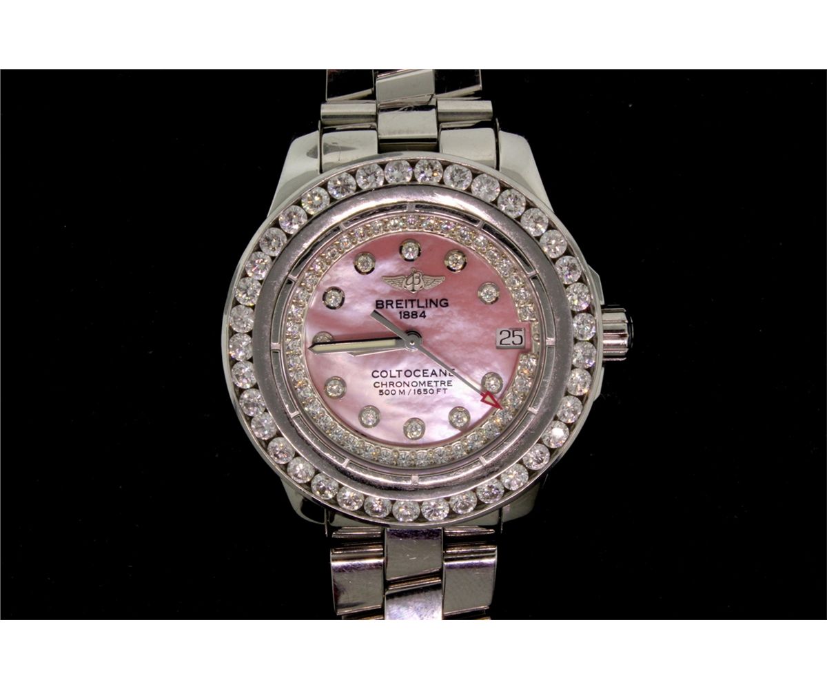 WATCH: [1] Ladies Breitling Colt Oceane stainless and dia wristwatch set with custom dia bezel and CZ inner bezel, with pink mother of pearl dia dial. Total dia weight is approx. 2.50 ct. Swiss chronometer movement. Model A77380. Serial #1213759. Comes with jewelry store box. Light wear on bracelet.
