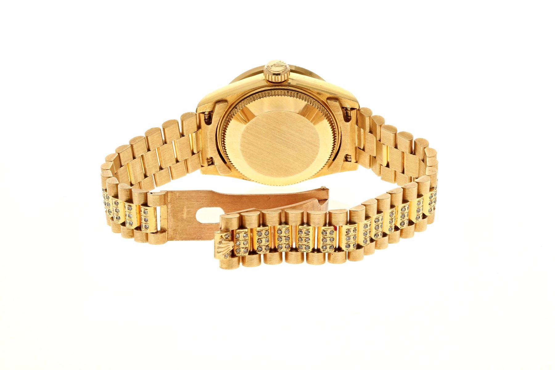 WATCH: [1] Lady's 14KYG date wristwatch with Rolex movement ;SN #2369276, movement #2235, diamond dial w/synthetic rubies, diamonds on links, 273 rbc diamonds, 3.50 cts. TWA. (replica) with original Rolex movement
