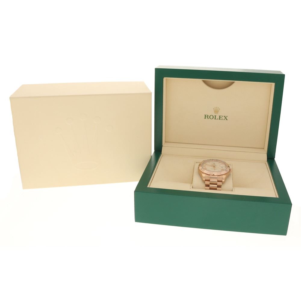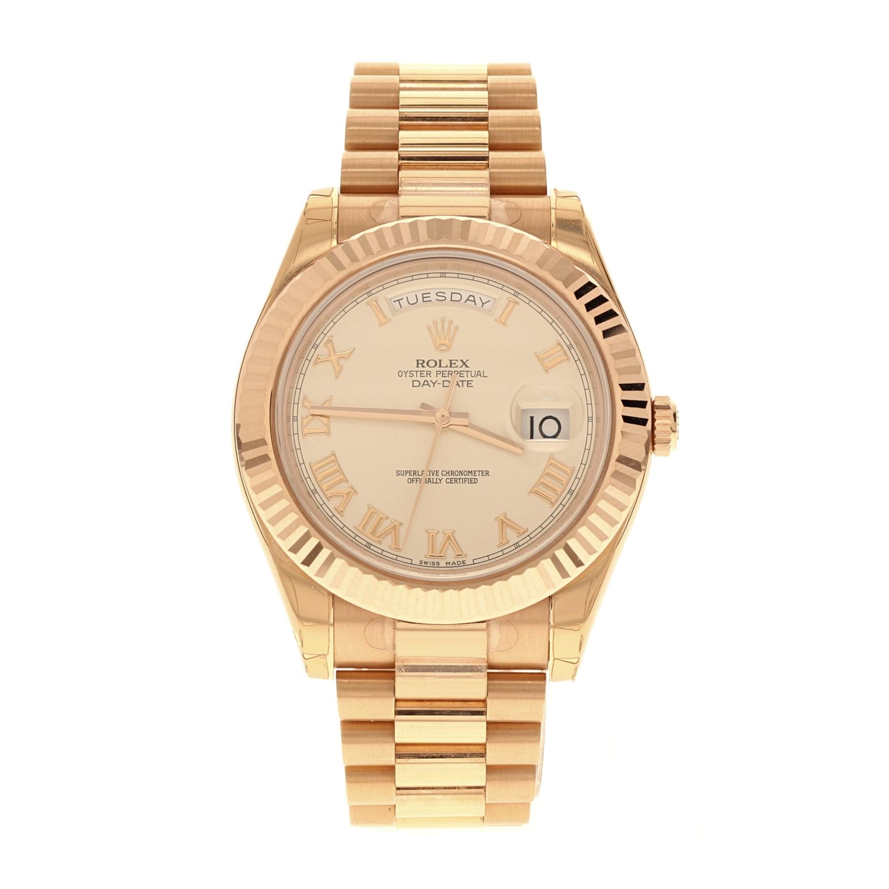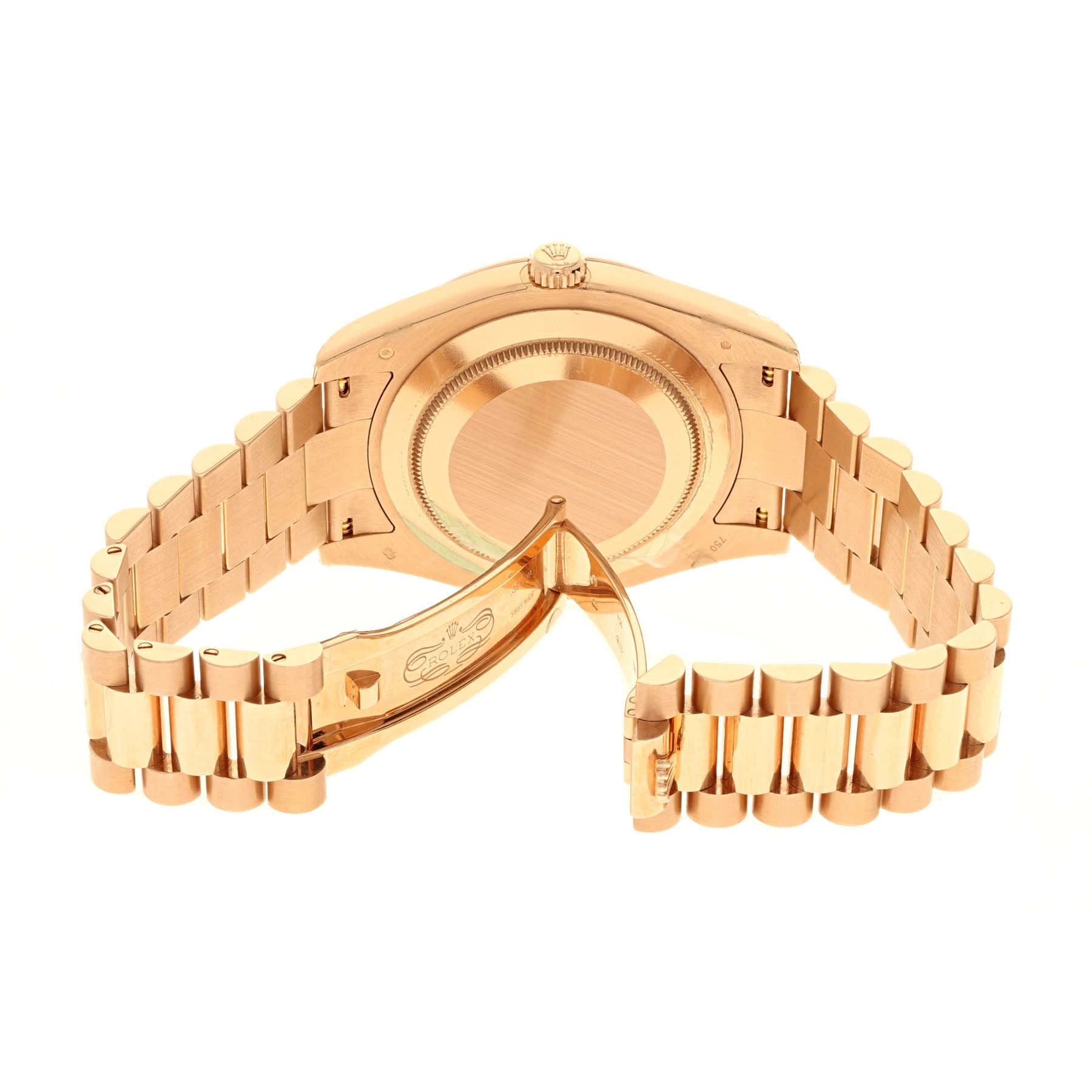 WATCH: [1] Man's 18kt Everose Rolex Oyster Perpetual President Day/Date watch, cream color dial, roman numerals, fluted bezel, model #218235, serial #996E7211, movement ID #1019D368, movement #3156, bracelet #83215.