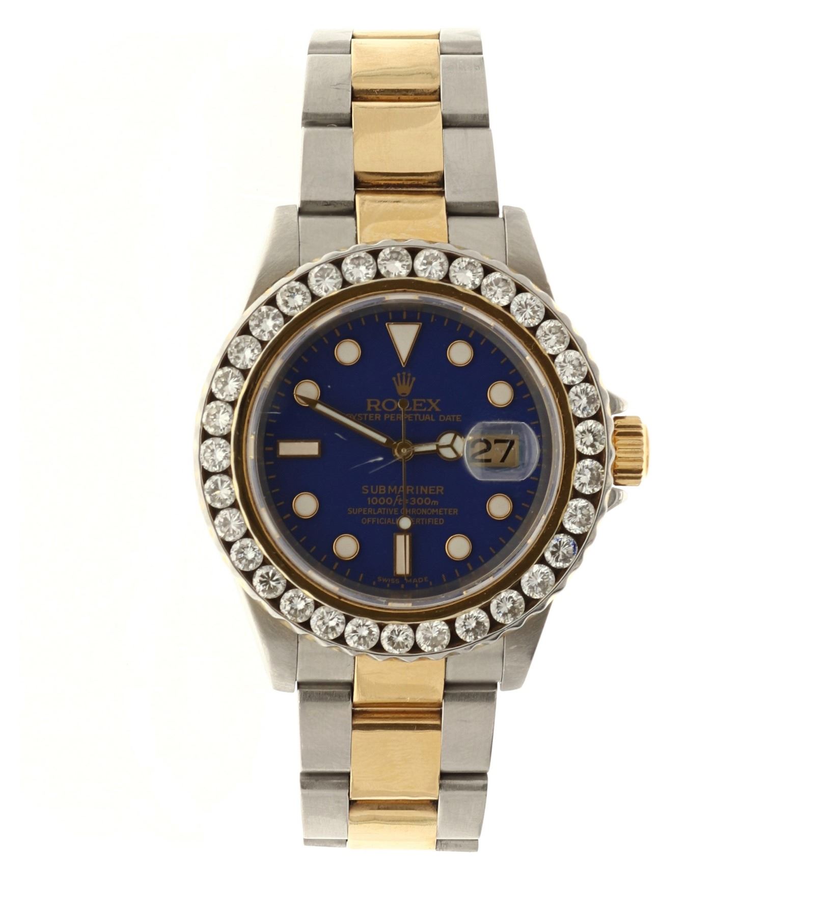 WATCH: [1] Man's S/Steel & 18KYG Rolex Oyster Perpetual Submariner, blue dial dot markers, non Rolex diamond bezel, 34 rbc diamonds, 5.50 cts. TWA., SI2/I, model #16613T, serial l# Z296190, movement ID #3 1181407, movement $3135, oyster bracelet #93253.