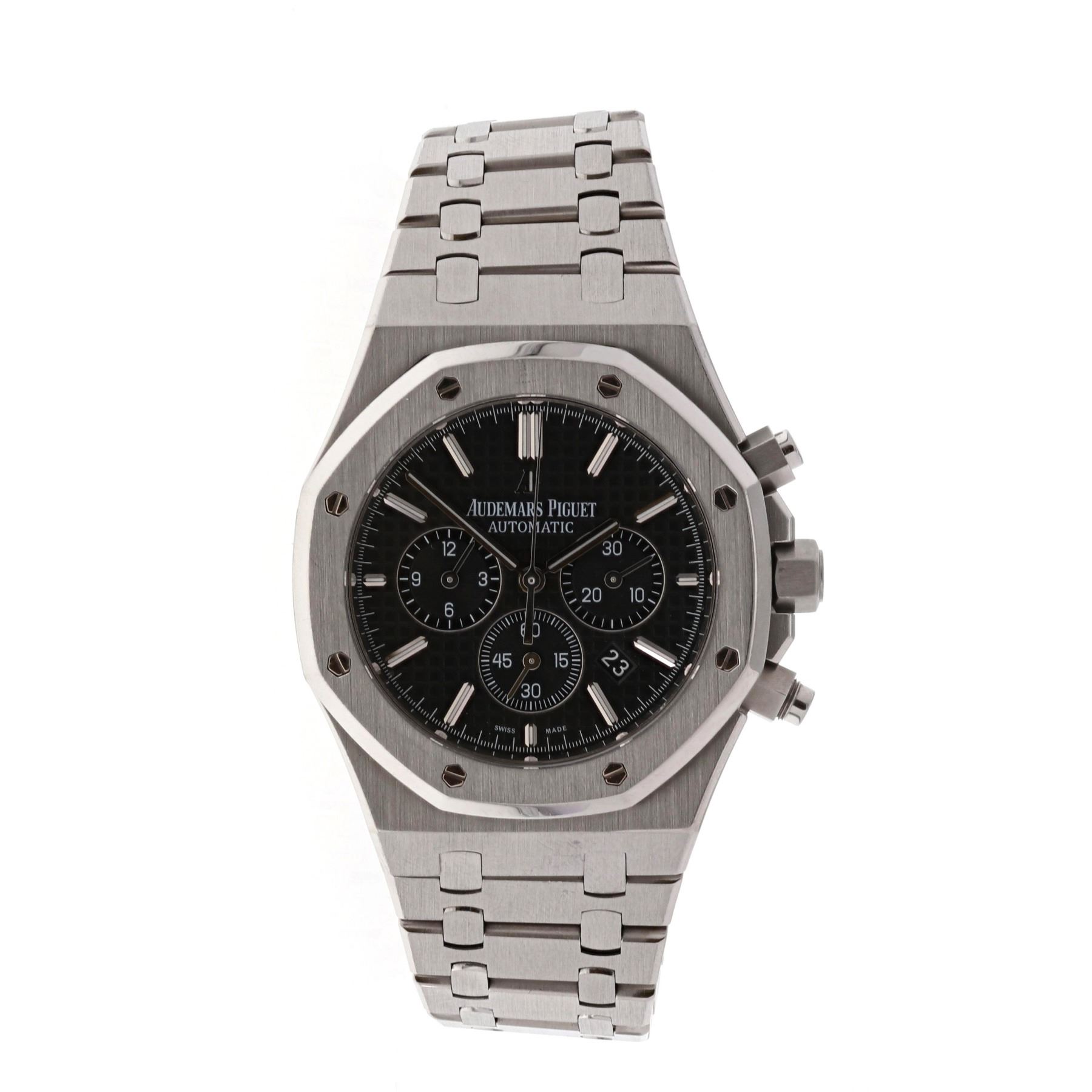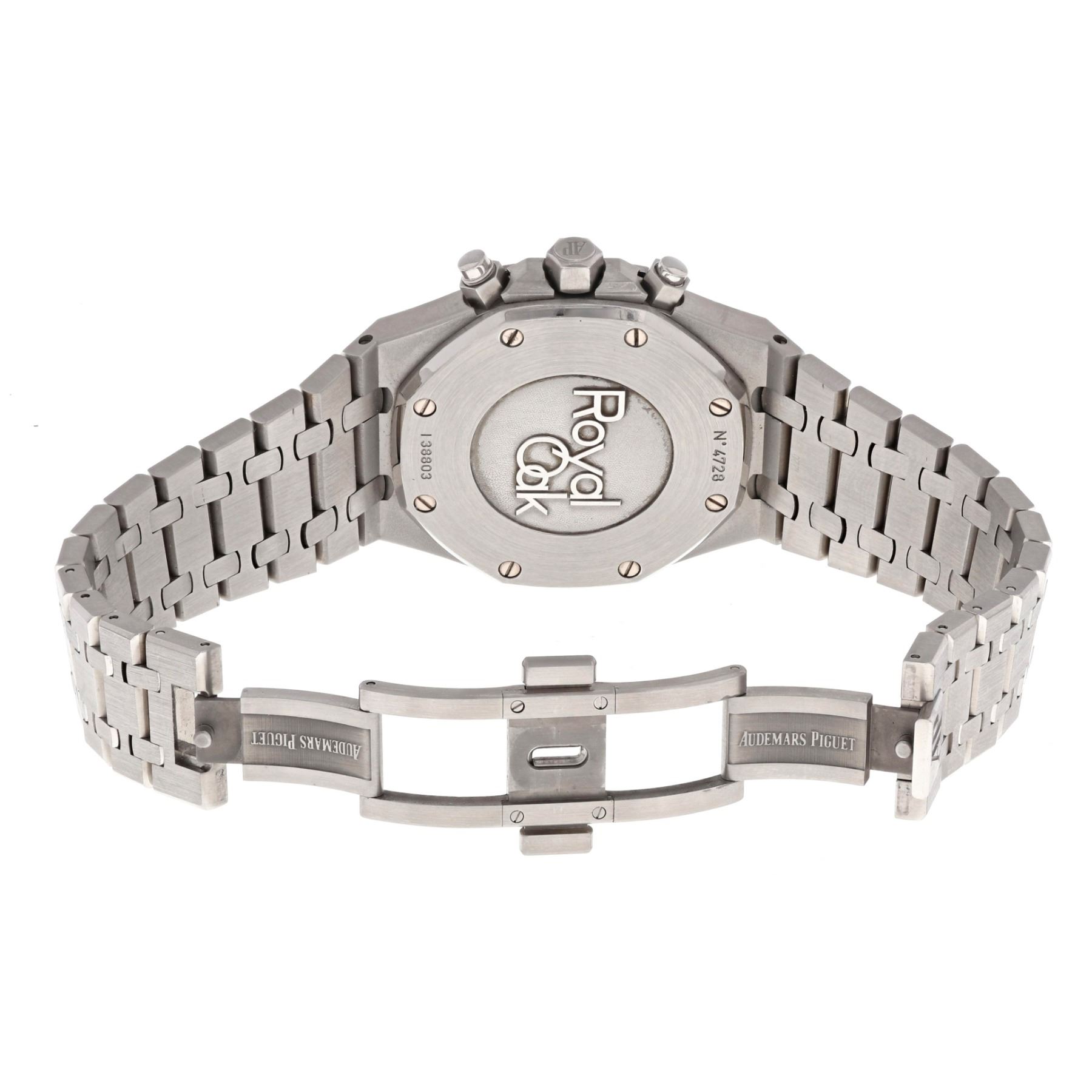 WATCH: (1) Man's S/Steel Audemars Piguet Royal Oak Date watch, 40.0mm case, 3 sub dials, 2 push button black dial, stick markers, model #4728, serial #138803.
