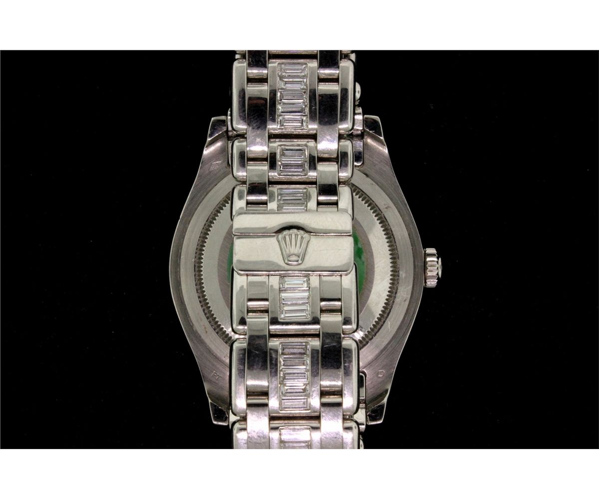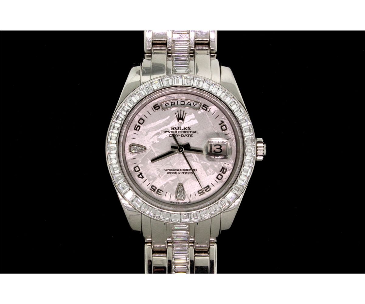 **AMENDED DESCRIPTION** WATCH: [1] Platinum gents Rolex Oyster Perpetual Day-Date Special Edition watch with meteorite dia. marker dial, bezel set with 42 trapezoid baguette diamonds and a platinum masterpiece bracelet set with 68 aftermarket baguette dia.s, F/G, VVS, circa 1995; model #18956, serial #W083594, movement #3155, movement serial #3 1532099, bracelet stamped: #72746 BRIL PT950 (Bezel diamonds are original and set by Rolex, band is set with aftermarket diamonds)