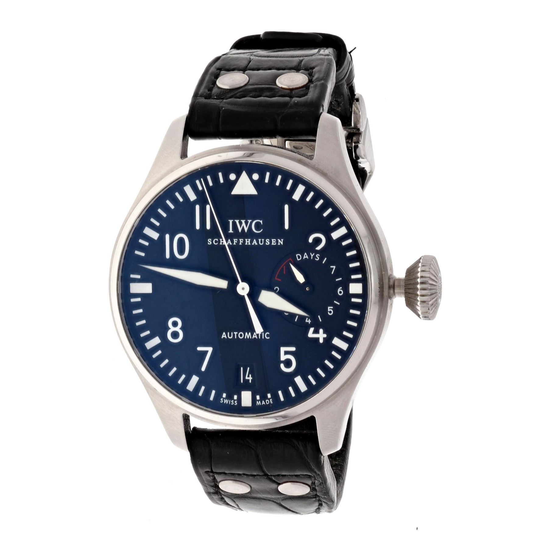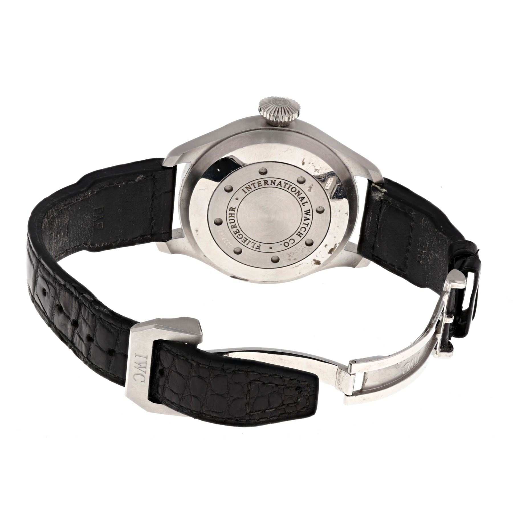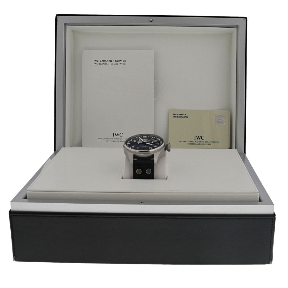 WATCH: [1] Stainless Steel IWC Big Pilot wristwatch; Black Arabic numbered dial with power reserve sub-dial; Stainless steel case (46MM); Black Alligator/Crocodile bracelet with deployant clasp; Model # IW500401; S/N 3377147; Movement Caliber 51110; Includes presentation box and IWC guarantee card. Box lid broken.