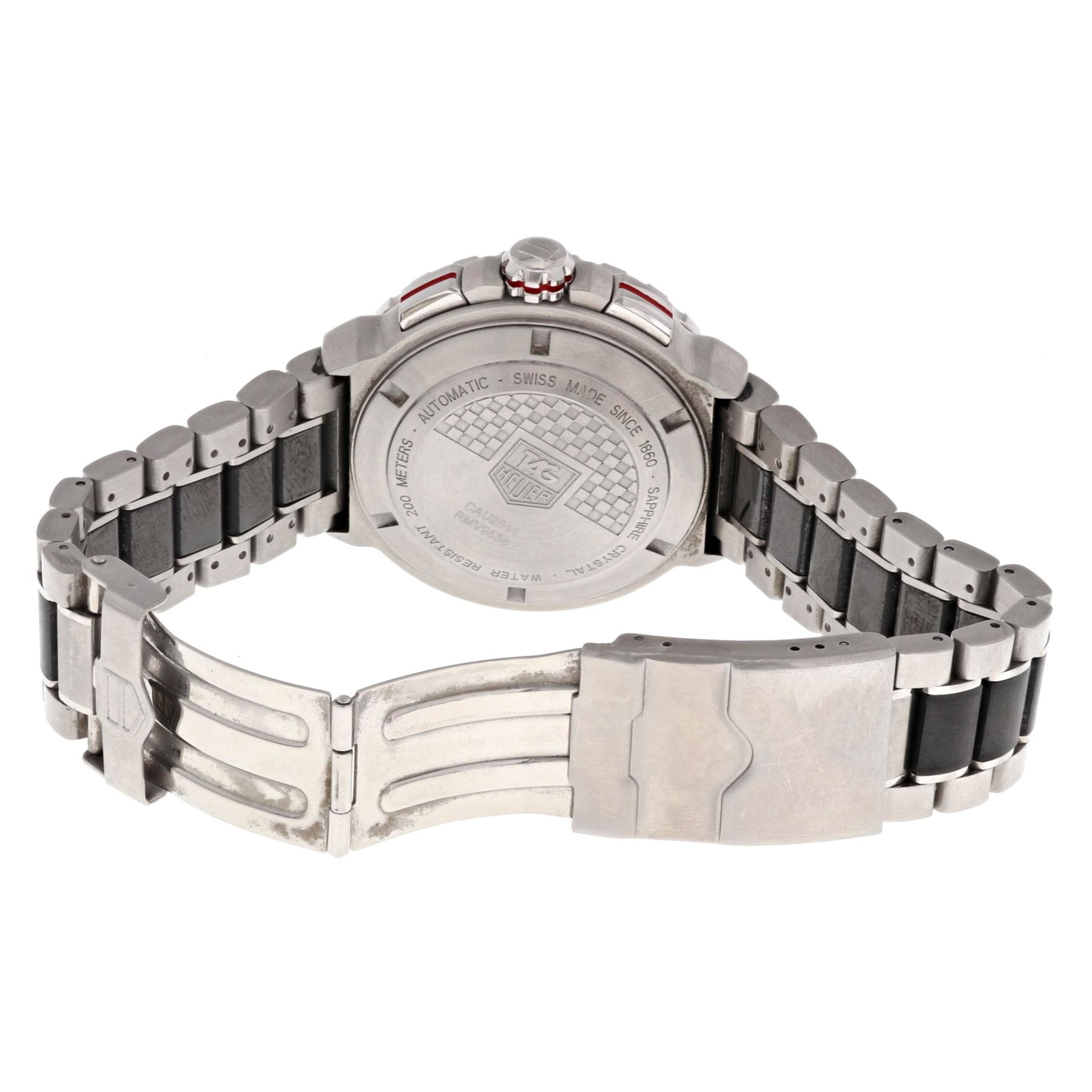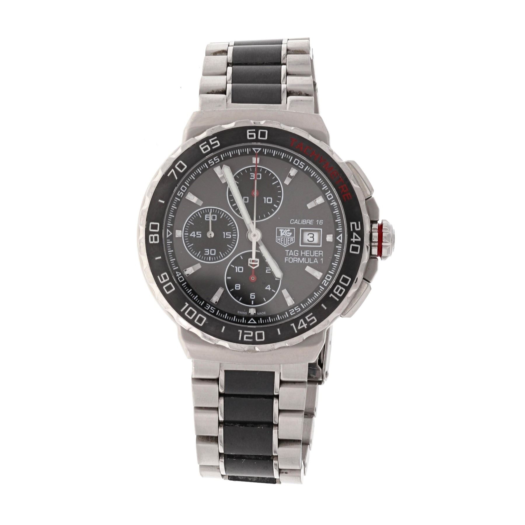 WATCH: [1] Stainless steel and ceramic Tag Heuer Formula 1 watch; 44mm case, grey dial with 3 sub dials, date @3:00; sapphire crystal, automatic movement, steel and ceramic bracelet; Model CAU2011; Serial Number RMV9556.