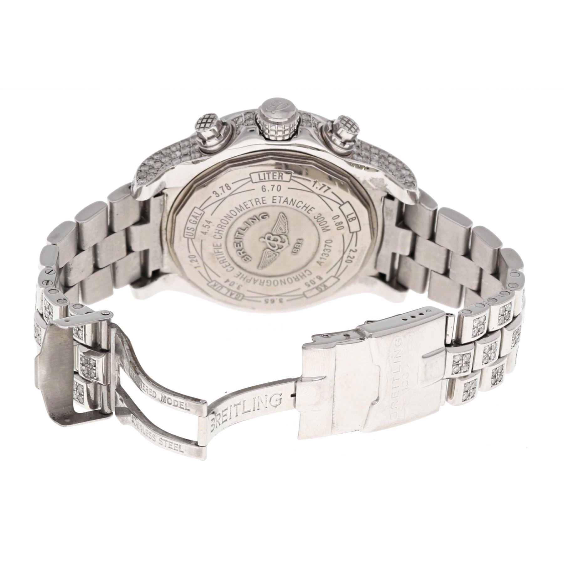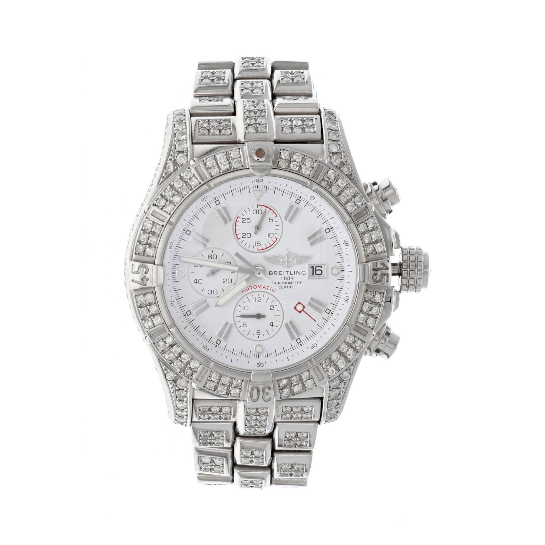 WATCH: [1] Stainless steel gents Breitling Super Avenger Automatic watch with a white dial; and the bezel, case, lugs and band are set with 456 aftermarket diamonds, approx. 12.50 cttw., good/H-J/ I1-I3; model #A13370, serial #2502083