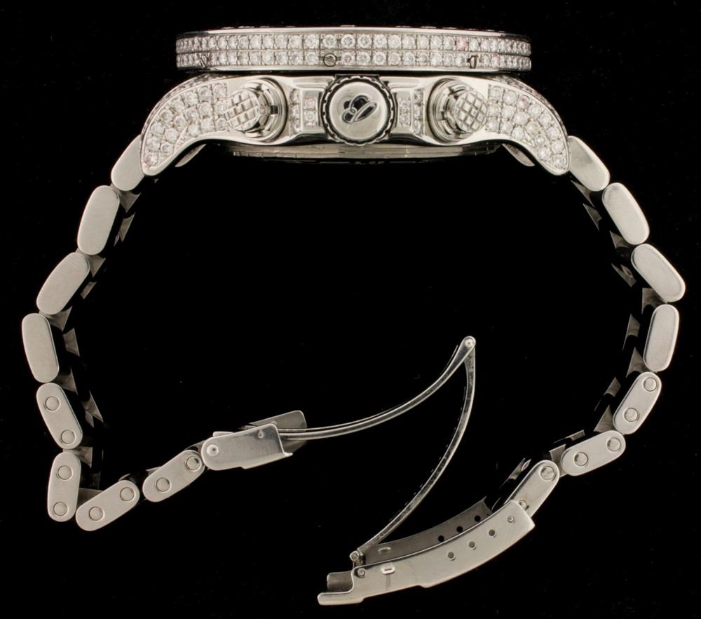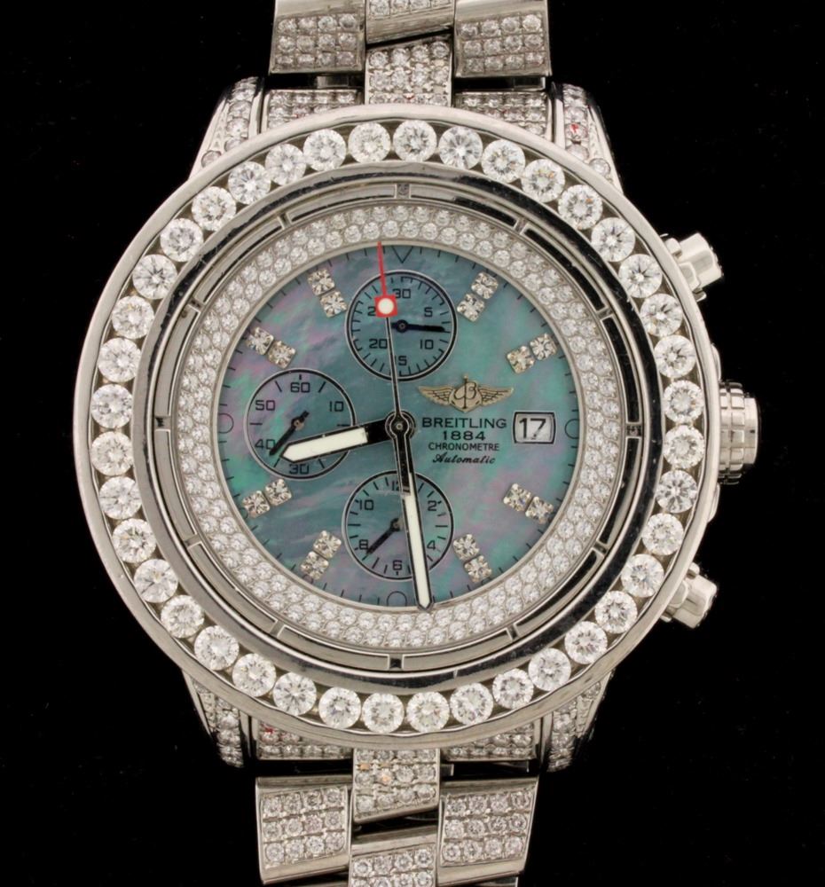 WATCH: [1] Stainless steel gents Breitling Super Avenger Chronometer Automatic watch with an aftermarket teal blue mother-of-pearl dial with the markers and the dial rim set with colorless synthetic atones; the band, case and the aftermarket bezel are set with diamonds, approx. 20.50 cttw., good/ H-J/ SI1-I1; watch is 9 1/2"s; model #A13370, serial #2215841. Missing stone in band