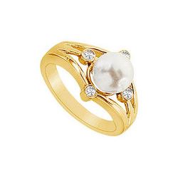 Cultured White Akoya Pearl And Diamond Ring : 14K Yellow Gold - 0.15 CT Diamonds