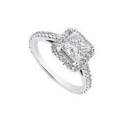 A square diamond is prong-set in the center and is haloed by smaller round diamonds all around it & on the sides too. Made in 14K white gold Th...