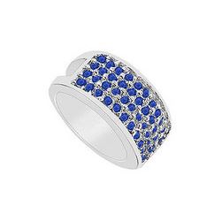 Fourty-four brilliant-cut round blue sapphires are prong-set in eleven equal rows. Made in 14K white gold this bold ring has a total gem weight (TGW