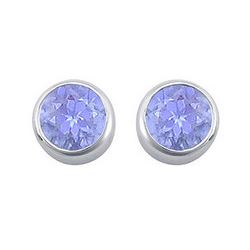 Three stone engagement ring with two white CZs are bezel set beside round created tanzanite in prong setting. Made in 14K white gold and has a total g