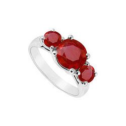 A bigger round GF bangkok red ruby is accented by two smaller created rubies on the sides. Made in 10K white gold this three stone ring has a total we