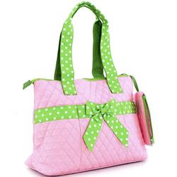 Quilted Medium Diaper Bag W/ Bow & Polka Dot Trim - Pink/Green