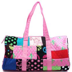 Women's Large Patchwork Quilted Duffle Bag w/ Bonus Makeup Bag - Pink/Green