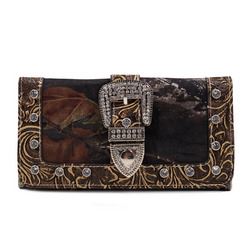 Mossy Oak (R) Camouflage Tri-fold Western Buckle Wallet with Rhinestones and Croco Trim