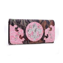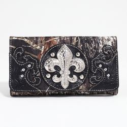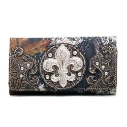 Mossy Oak (R) Camouflage Tri-fold Wallet w/ Rhinestone Fleur de Lis & Floral Trim
