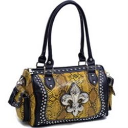 Women's Rhinestone Fleur De Lis Adorned Snakeskin Shoulder Bag With Side Exterior Pockets - Yellow
