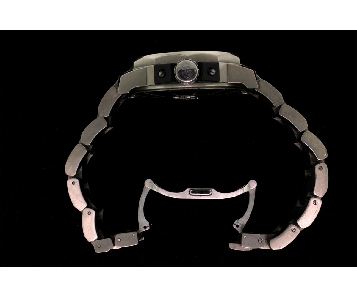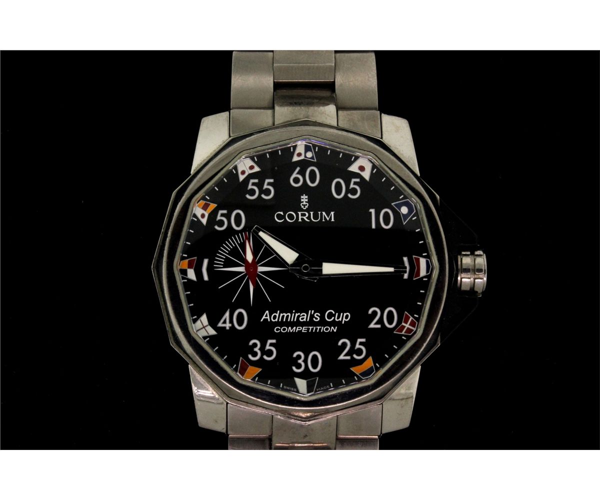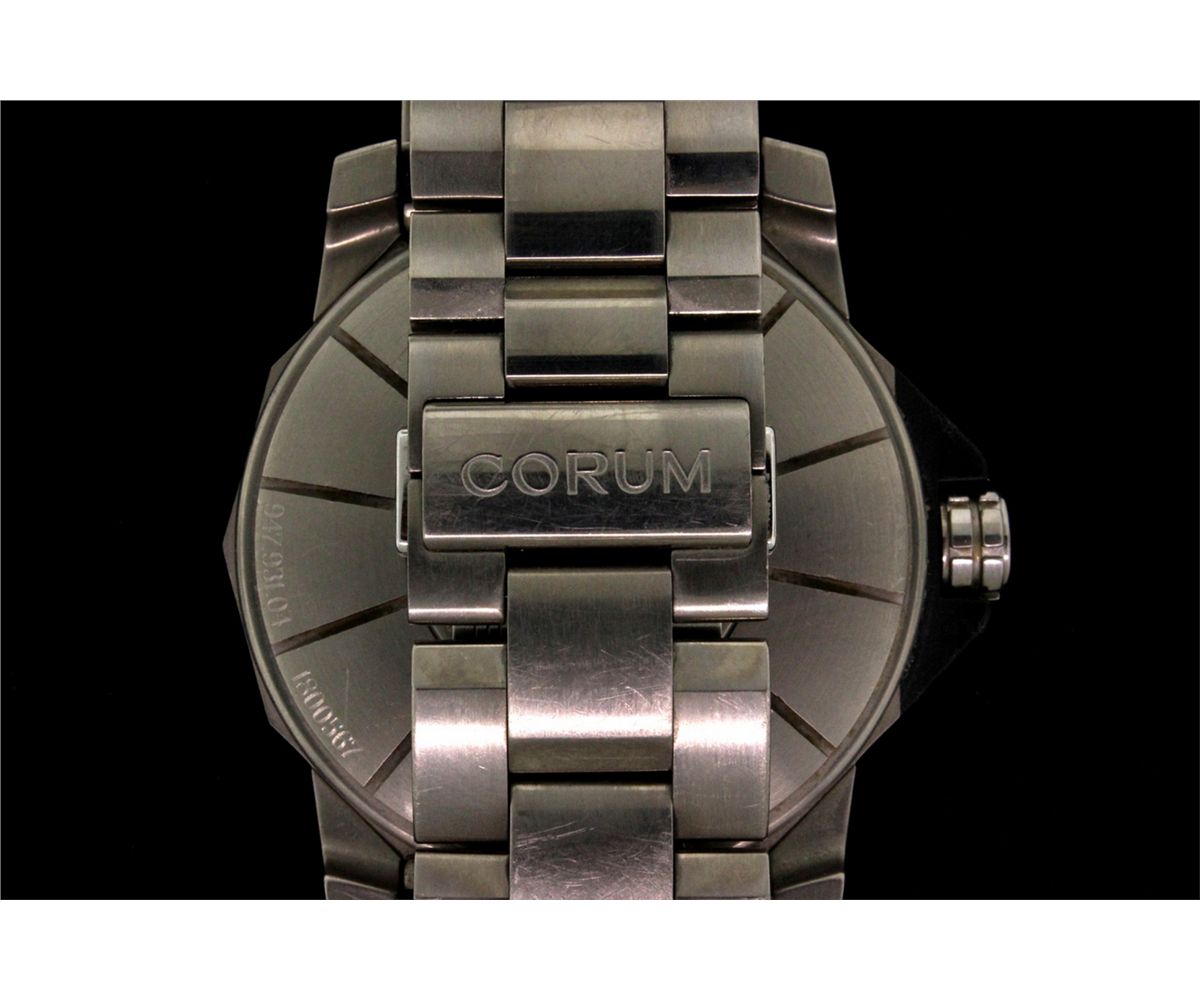 WATCH: Men's titanium Corum Admirals Cup wristwatch; 46.5mm round case; black dial w/ flag border, day/date at 3; black crown guard; titanium link bracelet; automatic mvmt; Model 947.931.04; Serial 1800567.