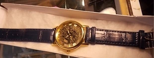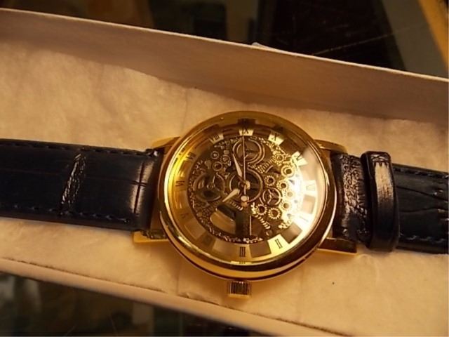 WATCH - NEW 2 SIDED SKELETON WATCH WITH LEATHER STRAP - WORKING- GOLD TONE