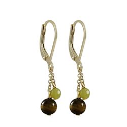 6Mm Tiger Eye And 4Mm Olive Jade Semi Precious Balls On Gold Plated Sterling Silver Lever Back Earrings, 1.18"