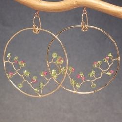 Metal: SilverHammered circles with peridot and pink tourmaline wrapped around inside, about 2". Available in either 14K gold-filled, rose gold-...
