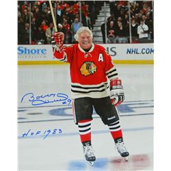 Bobby Hull signed Chicago Blackhawks on ice holding up stick 16x20 photo with 'HOF 1983' inscription. Item comes with a Schwartz Sports Mem...