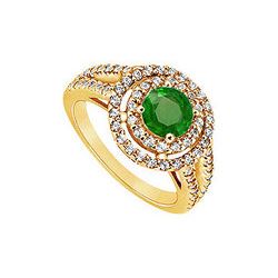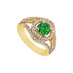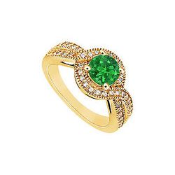 A brilliant-cut round emerald is prong-set in the center & is accented by round curving & swirling rows of smaller diamonds. This engageme...