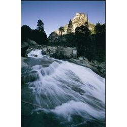 Water Rushes Down A Steep Slope Beneath A Sunlit Peak