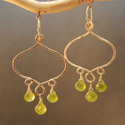 Metal: GoldLarge hammered swirl drops wrapped with peridot, prehnite, and tourmaline inside, about 2" long.Available in either 14K gold fill or...