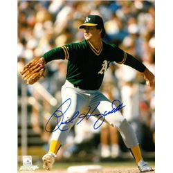 Rick Honeycutt Signed Oakland Athletics 8X10 Photo (Green Jersey Pitching)