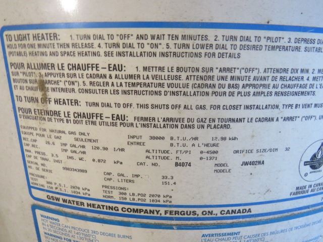 WATER HEATER (GAS) *38000 BTU* (151.4 LITRES) *48" H X 20" DIAMETER)