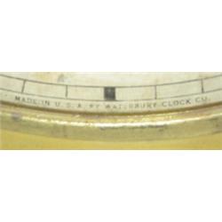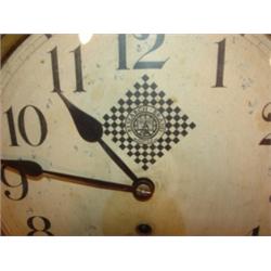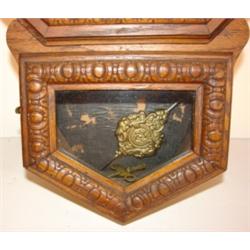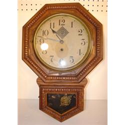 WATERBURY OAK REGULATOR WALL CLOCK. Marked on face "Research Brand-Waterbury". Ornate trim. Has key and pendulum. Minimal wear to face. 22" H, 15" W