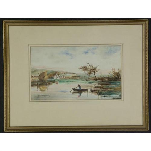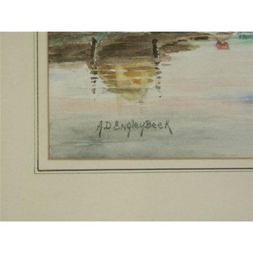 WATERCOLOR ON PAPER 8 1/2'' x 14'', Alice Dow Beek (1867-1951), WA. ''The Village Ferry''. Signed lower left. Paper label on the verso. Matted with decorative stenciling and placed in a goldtone frame. Beek, who resided in Tacoma, was an internationally known watercolor artist, especially in France where she recieved the coveted Grand Prix at the Paris Exposition Internationale in 1897. More info. in the white binder.