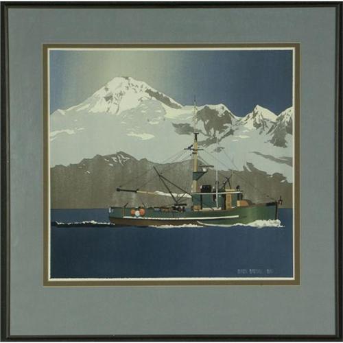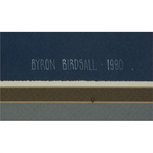 WATERCOLOR ON PAPER 18'' x 19'', Byron Birdsall (1937-), AK. ''Mountain Marine''. Signed and dated ''1980'' lower right. Kirsten Gallery label on the verso. Titled on the verso. Double matted and placed in a black metal frame. A noted Alaskan watercolorist, Birdsall utilizes techniques he gleaned from studing the works of Japanese woodblock printers. More info. in the white binder.