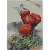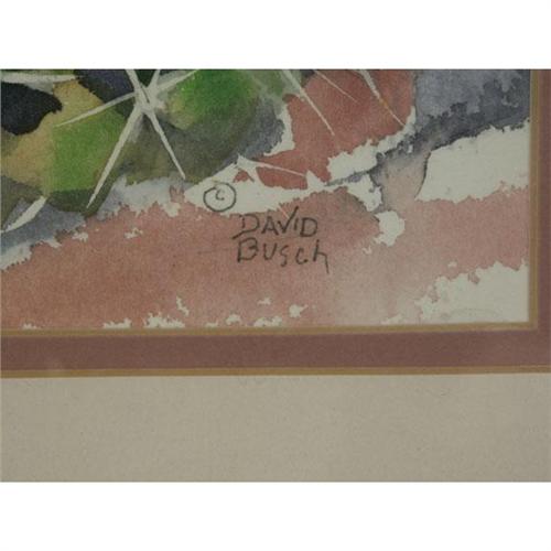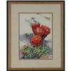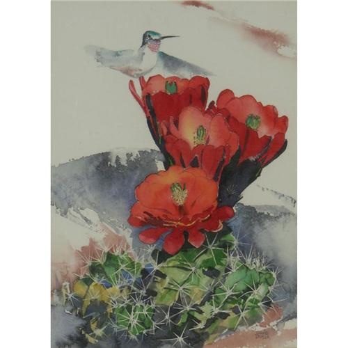 WATERCOLOR ON PAPER 14'' x 10'', David Busch. Hummingbird on a Cactus Flower. Signed lower right. Double matted and placed in a wood frame.
