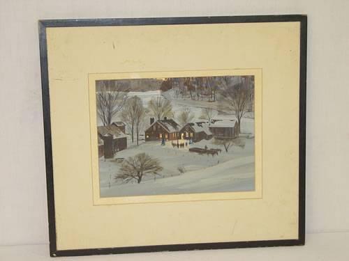 WATERCOLOR-GOUCHE NEW ENGLAND CAROLING WINTER SCENE SIGNED TOM HOYNE, MATTED (9 1/4" X 12 1/4" SIGHT) - SPOTTING TO MAT;
